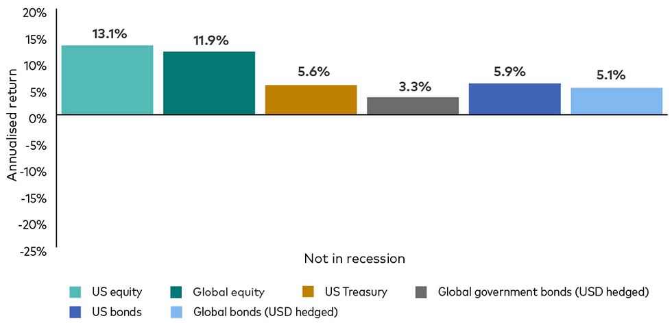 Note: US equity and global equity significantly outperform various classes of bonds during non-recessive periods.